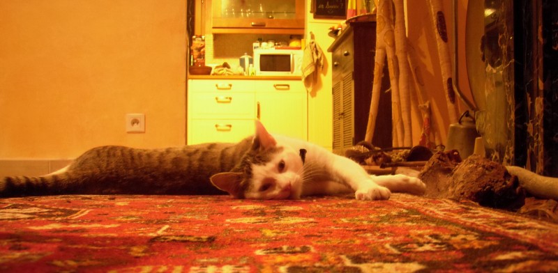 En ce moment, les dernières braises se consumment et Che (celui qu’on voit ici en photo) dort tranquillement sur le tapis à côté. Je ne vais pas tarder à aller en faire autant… mais dans mon lit, tout contre mon foyer favori qui roupille déjà à poings fermés 😉