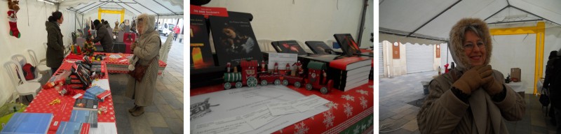 Il faisait -2° lorsque nous avons quitté la maison hier matin, avec le coffre bien chargé. Le marché de Noël où Anti avait un stand se tenait en plein centre-ville, sur la place de l’Horloge. Les exposants étaient installés sous une tente supposée être chauffée, mais elle ne l’était pas du tout.