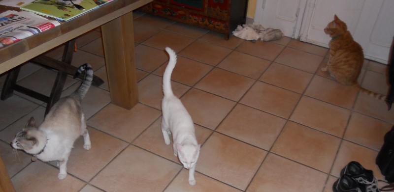 Le reste de notre petite meute a rejoint l’étage pour se restaurer. Pour cela, Anti a dégagé l’amoncellement de planches posées sur la trémie de l’escalier à chaque fois que les uns ou les autres appelaient pour passer. La première fois, ils étaient trois à attendre là patiemment, les minous.