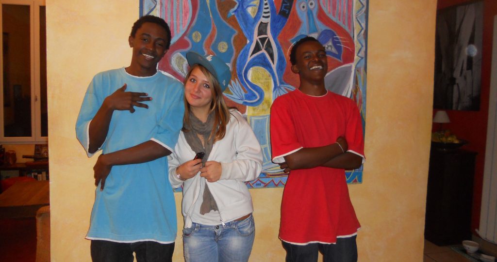 Les couleurs sont à tout le monde. Hier de passage chez nous, deux frères, grands copains de Gwlad venus passer dire bonsoir avant de rentrer chez eux dans la ZUP voisine, ont posé devant notre tableau plein de couleurs parce qu’ils trouvaient que ça faisait beau. Les trois ont éclaté de rire en remarquant qu’ils formaient notre drapeau.