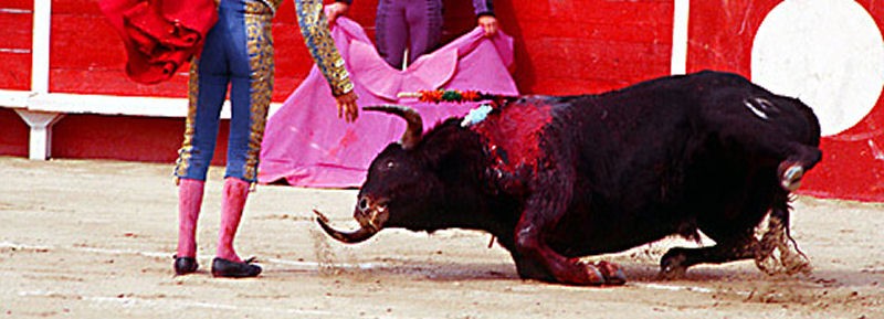 2 – Arrêtez aussi avec cet argument absolument infect qui consiste à justifier la torture et la mise à mort du taureau par le fait qu’il a vécu heureux pendant quelques années avant de finir comme ça. Ou alors, appliquez-le à votre chien ou votre chat : donnez-lui une vie heureuse pendant quatre ou cinq ans et tout d’un coup, poussez-le dans une arène pour le faire transpercer par des lances, des harpons et une épée jusqu’à ce qu’il succombe, en vous disant que c’est normal de finir comme ça puisqu’il a eu une vie heureuse.
