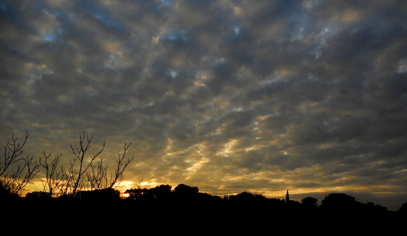 Hier, après la pose du plancher, le premier Vélux a été mis en place. En montant sur un escabeau ou une chaise, il nous est enfin possible de voir depuis chez nous le soleil se coucher sans aucun obstacle pour l’occulter. Alors, même s’il y avait beaucoup de nuages, je n’ai pas attendu plus longtemps pour prendre quelques photos.