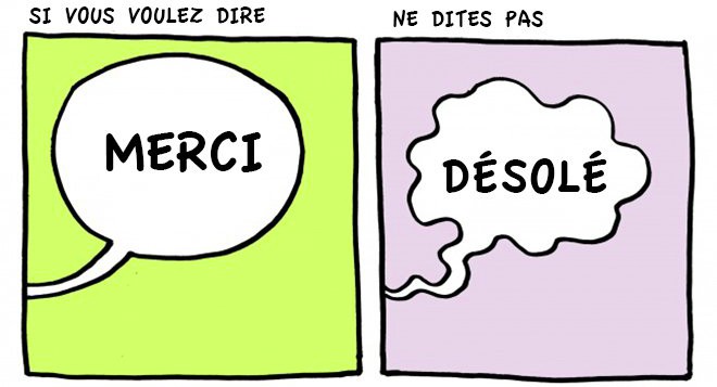 « Apprenez à dire « merci » plutôt que « désolé » : cette BD va vous changer la vie » tel est le titre d’un article paru sur Démotivateur et c’est tout un challenge, en tout cas pour moi qui ne suis pas d’humeur à être désolée en ce moment et encore moins à remercier ou alors, si, mais alors plutôt dans le sens de « congédier ». Néanmoins, je perçois le côté très instructif de la démarche, du coup, je pose ça là, histoire de savoir où le retrouver 🙂