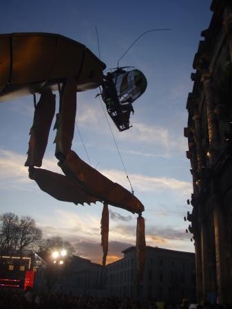 Ce qu’ils font est vraiment génial. Très bonne musique, spectacle enchanteur avec la mante géante et les échassiers vraiment renversants (c’est le cas de le dire) – je ne savais pas qu’ils faisaient partie de la même troupe que les personnes qui manipulaient la mante.
