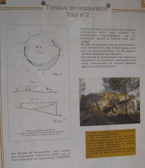 Le domaine d’Escattes est un ancien domaine agricole qui bénéficie d’une nouvelle mise en valeur du patrimoine naturel et bâti de garrigue notamment la relance de l’activité oleicole : expérimentation de nouvelles techniques d’exploitation, présentation de collections variétales, restauration de la source Font-l’Abbé et des différentes tours et capitelles existant sur le site, aménagement d’un parc d’agrément et de sentiers de découverte (Source Nîmes.fr).