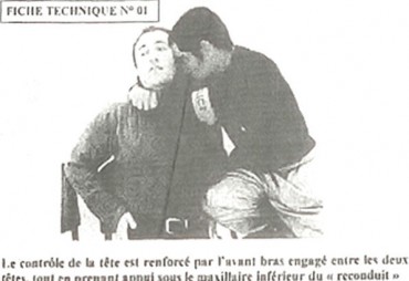 Le policier doit « entourer le cou du reconduit avec son bras » et lui « imprimer un mouvement de rotation », puis « maintenir cette pression entre trois et cinq secondes pour assurer la contrainte de régulation phonique ».