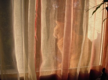 Les chats étaient en harmonie parfaite avec le moment. Che dormait sur un coussin au pied d’un radiateur. Kundun occupait notre lit de tout son long comme à son habitude. Santiago avait choisi de somnoler entre ombre et lumière. Assis sur le rebord de notre fenêtre, Mirou, en vénérable sage, méditait, face au couchant, devant le paysage encore enneigé.