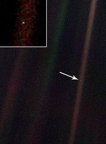 On a dit que l’astronomie offre une expérience d’humilité qui forge le caractère. Il n’y a peut-être pas de meilleure démonstration de la folie de la vanité humaine que cette image distante de notre monde minuscule. À mes yeux, elle met en évidence notre responsabilité à nous conduire plus humainement les uns avec les autres, et à préserver et chérir ce point bleu pâle, le seul foyer que nous ayons jamais connu.