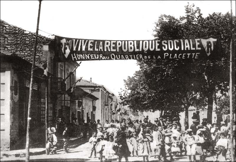 1872 – Le 4 septembre 1872, les républicains voulurent fêter à leur manière le second anniversaire de la proclamation de la troisième République. Une foule compacte de près de 5000 personnes se répandit sur la Placette et dans les rues adjacentes. Tout ce monde avait arboré des cocardes, des cravates et des ceintures rouges et pour mieux marquer le sens de cette manifestation, des bustes de la République, coiffés de bonnet phrygien avaient été placés sur les fenêtres. Des farandoles s’organisèrent pendant que des banquets réunissaient un grand nombre de convives, au milieu de chants révolutionnaires.