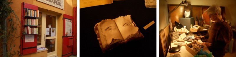 Pour commencer, nous avons rendu visite à Delphine, du Livre dans la peau. En ce moment, elle héberge les œuvres de Caroline Fawkes. L’artiste était présente et nous avons eu l’occasion de papoter avec elle en dégustant un délicieux jus de pomme chaud à la cannelle.