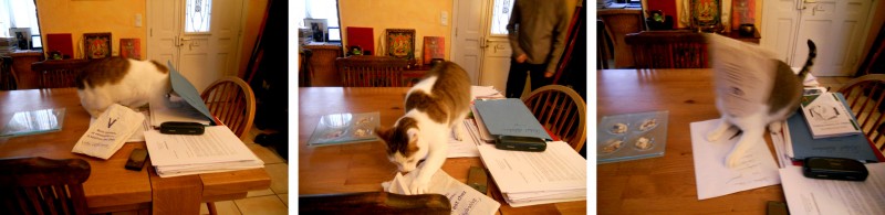 Sur les trois photos ci-dessus, on voit Che sur la table qui a repéré le doux fumet des croquettes magiques alors qu’elles ne sont plus là depuis longtemps. Il ne reste que la pochette en papier qui les contenaient – je rappelle qu’elles étaient conditionnées en emballage plastifié et scellé. Après avoir jeté un coup d’oeil dans une chemise contenant un manuscrit reçu par Anti, il se jette sur la fameuse pochette et, raide défoncé, en aspire les toutes dernières molécules de parfum de croquettes qui restent.