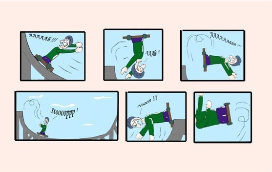 J’aime beaucoup l’histoire où il croise un groupe de skaters (la deuxième illustration de la note en est tirée). Il leur montre que question roulettes, il s’y connait largement plus qu’eux !