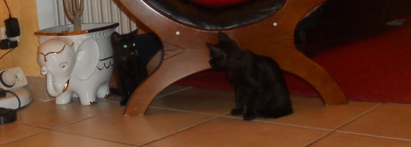 Il y a quelques jours, nous avons appris que l’une des bénévoles avait deux chatons à placer. Nous avons très vite répondu présent. Ils sont arrivés à la maison hier, un peu avant midi. Deux petites boules de poil toutes noires. Cerise sur le gâteau, j’avais justement très envie depuis longtemps d’en avoir de cette couleur-là, même si, quand nous avons dit que nous allions les prendre, nous ne savions pas encore qu’ils étaient noirs.