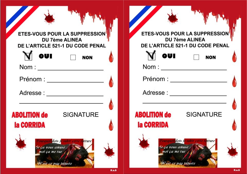 Ce 11 juin 2012, l’opération « enveloppes rouges et blanches à l’Élysée »* consiste à demander au nouveau président de la République la suppression de l’alinéa 7 de l’article 521-1 du Code pénal autorisant les corridas et les combats de coqs dans certaines régions. En principe interdits et punis de « deux ans d’emprisonnement et 30000 euros d’amende » comme les autres « sévices graves ou actes de cruauté envers les animaux », les corridas et les combats de coqs constituent deux exceptions autorisées par cet article dans les régions où « une tradition locale ininterrompue peut être invoquée ». Dans les 11 départements du Sud de la France où la corrida est encore pratiquée, l’opposition a toujours été la plus marquée. Cette année encore, la mobilisation suscitée par les manifestations est sans précédent depuis que les corridas ont repris début mai pour tout l’été.
