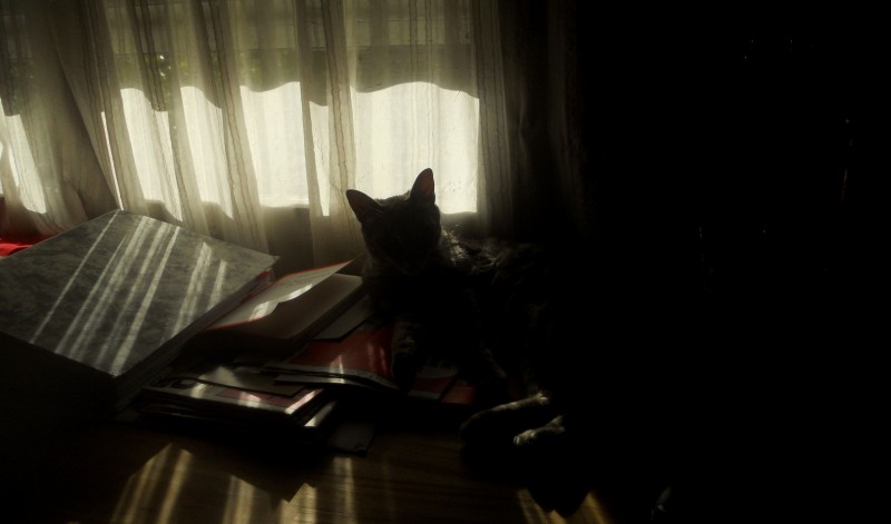 Alors voilà, hier, c’était étirements, câlins et siestes dans la pénombre confortable de notre séjour, à la lumière tamisée des volets mi-clos et des rideaux tirés. Dehors, il faisait plus de 35° à l’ombre, donc probablement très au-dessus de 40° au soleil. Et l’été n’a qu’une semaine.