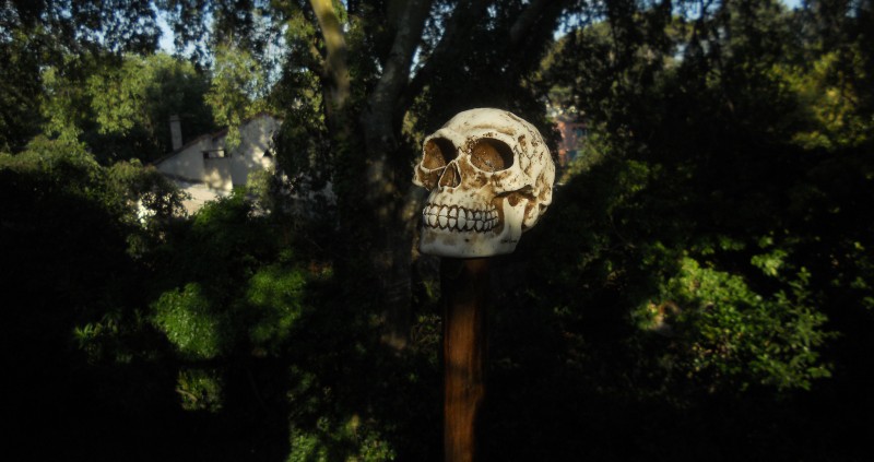 Le crâne en question, acheté sur le net comme il se doit, est en fait une tirelire en plastique pour hamletophiles philosophes. Anti a soigneusement bouché la fente sur le dessus avec de la colle à bois. Puis, elle a bourré l’intérieur de pâte à papier et, après avoir retaillé au millimètre près le bout du bâton pour l’ajuster au mieux, l’y a enfoncé et fixé solidement sous la calotte.