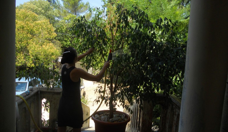 Ce dimanche était jour de fête pour notre ficus. Vous l’avez probablement vu sur de nombreuses photos prises dans notre séjour. Il culmine à 2m50 environ et étale ses branches en toute liberté, recevant la lumière par au moins trois fenêtres en permanence (elles n’ont aucun volet, juste des barreaux, donc c’est soleil à volonté).