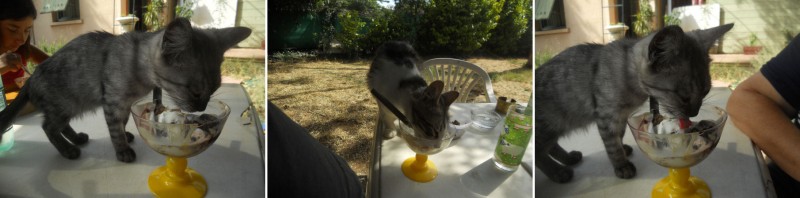 Samandra nous a servi des glaces délicieuses. Nous avons laissé le temps passer en jouant avec les chats (dont certains ont partagé les glaces avec nous), nous avons beaucoup parlé de l’infatigable dévouement des bénévoles des Chats Libres mais aussi de nos amis du CRAC et de la lutte anticorrida qui nous semble gagner du terrain partout et nous n’avons repris la voiture qu’à regret en promettant d’organiser un bon repas ensemble d’ici peu.