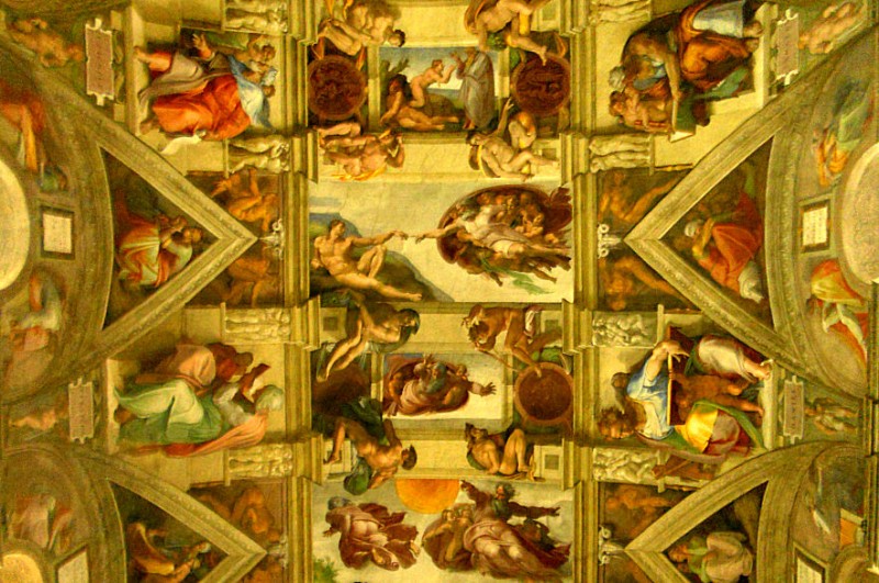 La voûte, de quarante mètres sur treize est à vingt-et-un mètres du sol (l’équivalent de sept étages, pour donner une idée). Elle est décorée de neuf scènes tirées de la Genèse, dont le célébrissime tableau de La création de l’Homme où Dieu tend sa main vers celle d’Adam… et d’autres tout aussi magnifiques à admirer, même si le cou est mis à rude épreuve.