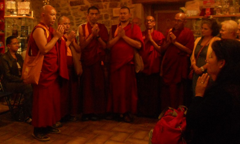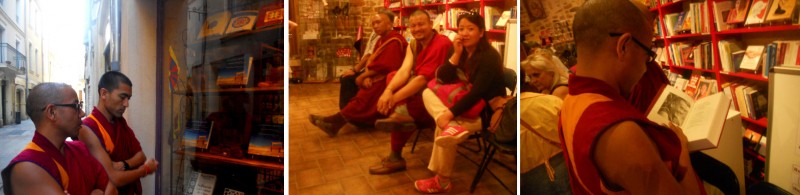 Pour les rares personnes parmi vous qui ne parlent pas tibétain, tashi delek est l’équivalent de notre bonjour. Et c’est donc l’expression que nous avons employée lorsque nous avons retrouvé nos amis moines du Ladakh à la librairie L’Hors du Temps, près de la mairie de Nîmes. Trois d’entre eux étaient en effet déjà présents il y a trois ans. Nous avons fait la connaissance des trois autres et de Dolma, la traductrice.