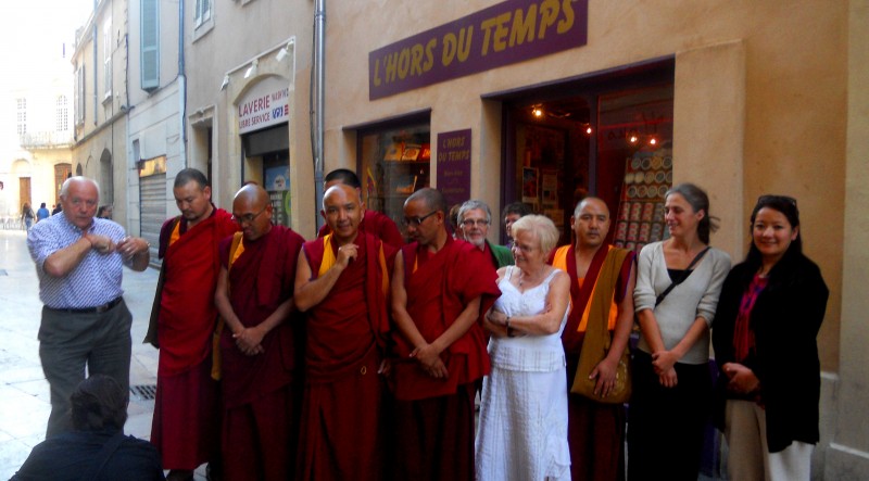 Ils ont toujours autant d’humour, de joie de vivre et de simplicité dans tout ce qu’ils font ou disent. Un journaliste du Midi Libre était là pour immortaliser leur venue. Les passants jetaient un regard curieux en voyant les tenues safran, surtout quand nous allions devant la vitrine dans la rue pour parler plus tranquillement et profiter de l’air frais du soir.
