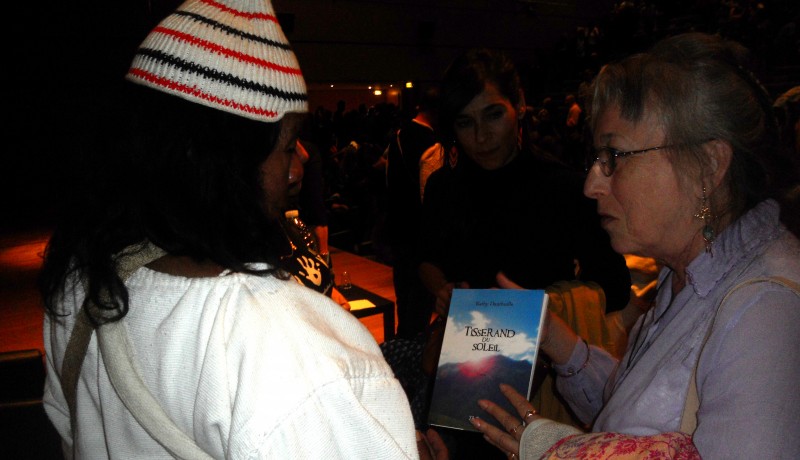 Lorsque tout-le-monde s’est levé, nous avons été plusieurs à rejoindre les Kogis sur la scène. Kathy avait apporté un exemplaire dédicacé de son livre, Tisserand du soleil, pour le leur offrir. Elle était très émue et son geste était typiquement kogi – faire un don en échange d’un don. Jose Gabriel Alimaco l’a remerciée. Notre Kathy planait bien au-dessus du septième ciel.