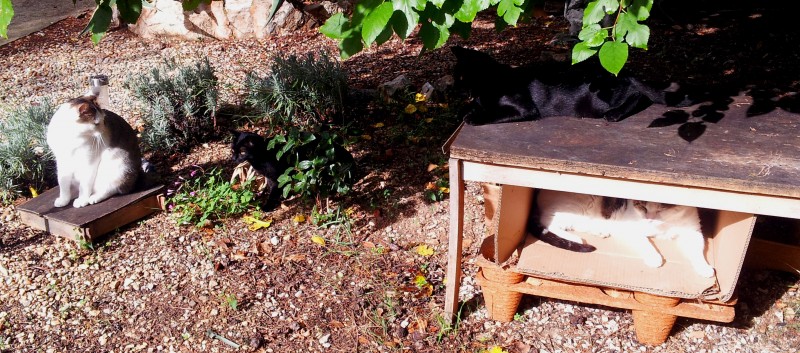 Le temps est plus ou moins incertain au-dessus de la France ces derniers jours. Cela nous vaut quelques belles ondées mais aussi des plages de soleil fort appréciées, surtout que la température est plutôt clémente pour la saison. Chez nous, comme nous avons repris le boulot, ceux qui en profitent le plus, ce sont les chats. Je vous ai parlé hier des petits coins qu’Anti leur a aménagés un peu partout dans le jardin. Ils servent aussi bien quand il pleut que quand il fait beau.