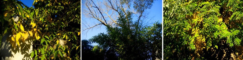 L’acacia devant la maison a enfin des feuilles jaunes, même si encore peu d’entre elles sont tombées. Certains autres feuillages de ci de là ont viré à l’orange ou au rouge.