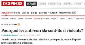 Dans une tribune récente publiée par l’Express, Raphaël Enthoven lance une charge virulente contre les anti-corrida qui ont critiqué son entretien avec l’aficionado Francis Wolff sur Arte. Il estime que ce sont eux qui sont bien plus fascinés par le sang et la mort que les pro-corrida, eux qui sont bien plus violents par leurs propos que ceux qui les ont sauvagement lynchés alors qu’ils étaient entravés au centre d’une arène pour empêcher que des veaux ne soient massacrés à l’arme blanche à Rodilhan, eux qui se comportent de façon bien plus condamnable que n’importe quels toreros torturant longuement un taureau jusqu’à ce que mort s’ensuive.