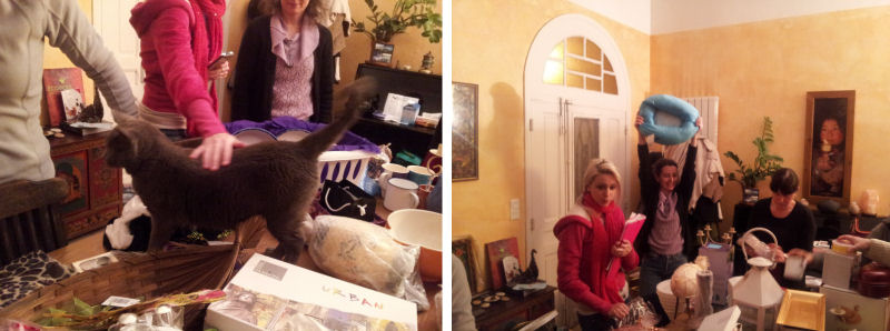 Hier soir, nous étions une douzaine à nous retrouver à la maison pour préparer tous les lots, après plusieurs semaines à avoir rassemblé des dons venus de partout – nourriture, alcools, vaisselle, livres, objets de déco, etc. – qui avaient été stockés dans notre grenier.