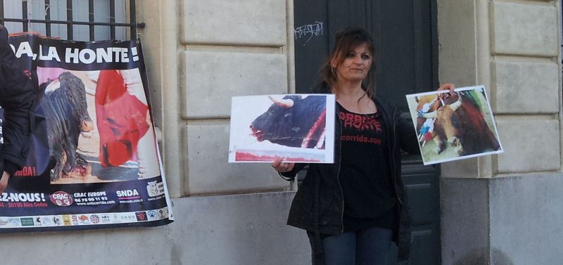 Nous étions une poignée à l’appel du CRAC Europe et de sa déléguée locale, Nathalie Valentin, tendant nos banderoles et nos photos de taureaux agonisants, et distribuant nos tracts pour dénoncer les écoles taurines, montrer la réalité des corridas et appeler à manifester à Alès les 11 et 12 mai 2013.