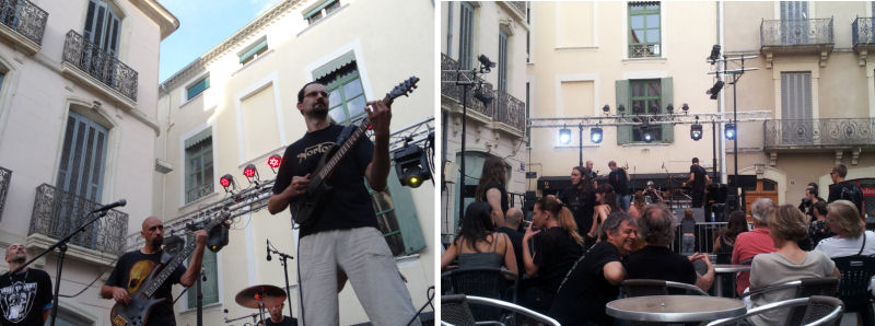 Hélène a bien fait de passer nous voir hier en fin d’après-midi. Elle nous a rappelé que c’était la fête de la musique et justement son Raph jouait à 20h près du théâtre. Raph est guitariste dans un groupe de métal, on n’allait quand même pas rater ça. On y était peu après 20h et l’ambiance était chaude. Des métalleux réjouis faisaient une haie d’honneur au premier rang. Ce n’était pas la Hellfest, mais c’était bien quand même.