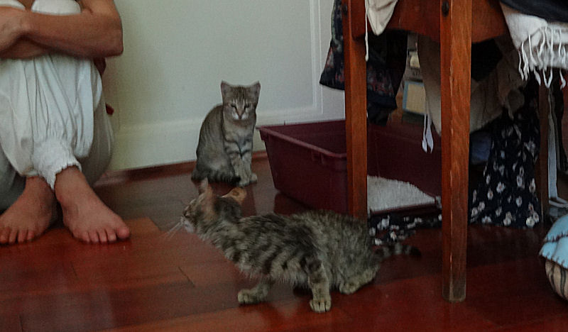 Ils vont probablement devenir vite copains de jeu, dès qu’il aura plus de tonus musculaire. Nous ne manquons pas de couvrir Abigaëlle de caresses pour qu’elle ne le prenne surtout pas pour un rival. Ce matin, un nouveau grand pas en avant : Rescue est sorti de la chambre pendant la nuit, il dort paisiblement sous l’un des fauteuils du salon.