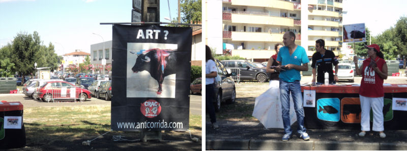 Nous avons distribué près de mille tracts d’information « Corrida, ne rien dire, ne rien faire, c’est être complice ! » Évidemment, l’accueil ne fut pas toujours chaleureux mais nous avons été visibles et vus par un grand nombre de personnes. L’action à ce niveau a été une véritable réussite. A plusieurs reprises, nous avons pu à nouveau entendre : « Dégagez, foutez-nous la paix. Laissez-nous vivre nos cultures et nos traditions tranquillement. Vous ne connaissez pas les Landes » (pour les propos les plus softs).