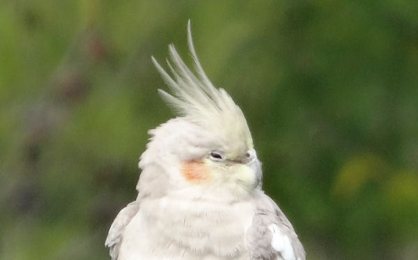 Nous l’avons regardé un bon moment. Et nous avons cherché sur internet, bien sûr. Un ara blanc ? Non. Un faucon blanc ? Non, ni un faucon , ni un vrai. Un perroquet blanc ? Euh, ben… Une perruche calopsitte blanche ? Ah oui, tiens, là, ça y ressemble beaucoup, avec la petite tache orange sur la joue. Cela dit, d’autres psittacidés auraient pu correspondre aussi. Bon, certainement pas un kakapo (ne riez pas, ça existe vraiment, on l’appelle également le whakapapa) ni un cacatoès. Mais allez savoir, on n’y connait rien, nous, en psittacidés et il y en a plein de variétés.