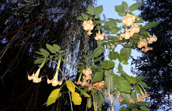 Ces plantes – des arbustes de cinq à six mètres de haut – sont spectaculaires. Les fleurs en trompette font plus de vingt centimètres de diamètre et pendent de façon harmonieuse, en émettant un parfum entêtant, très puissant, dès que le soir tombe. Les brugmansias ont des points communs avec les daturas mais ce sont deux genres différents, bien qu’ils aient été confondus à une époque. Les daturas sont des herbacées, les brugmansias des plantes arbustives. Les fleurs de datura sont érigées, celles de brugmansia sont tombantes.