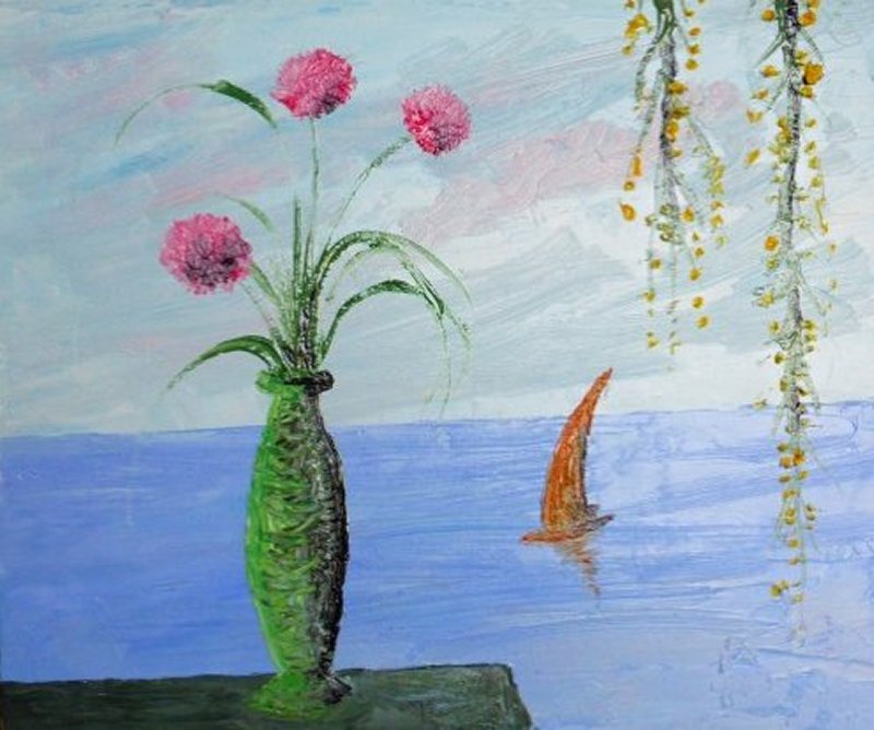 Ci-dessus : « – Trois armérias et un voilier – » Huile sur toile 30 x 24,5 cm