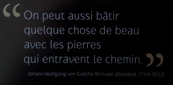 Posé sur un petit meuble dans l’une des pièces, un gros livre était ouvert sur une page citant cette phrase de Goethe : « On peut aussi bâtir quelque chose de beau avec les pierres qui entravent le chemin« . Elle ne pouvait mieux exprimer ce qui se joue ces temps-ci.