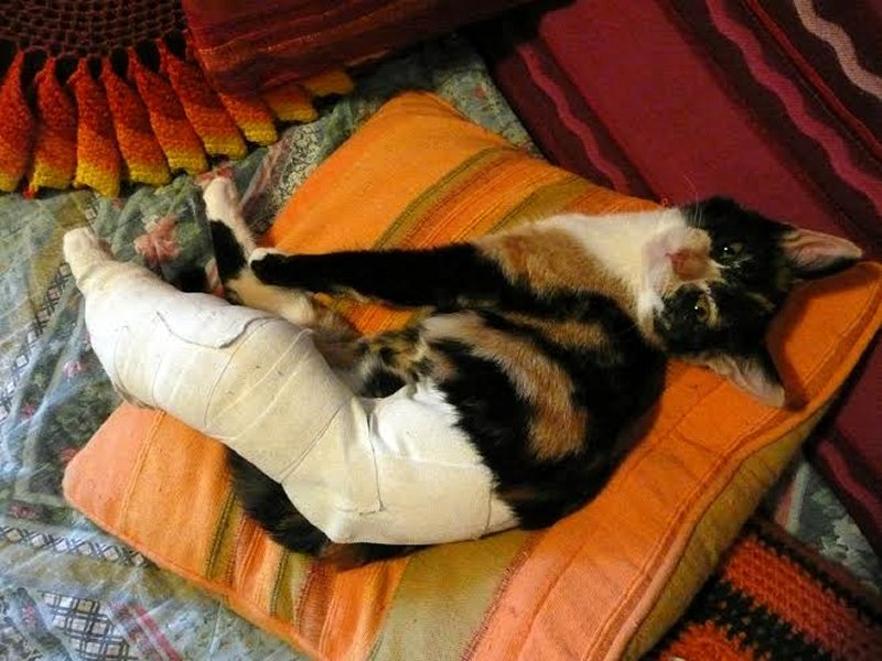 Décidément Callisto n’a pas de chance. Après avoir attrapé un virus « non identifié » dont elle s’est vite remise, la voilà avec une énorme « poupée » à la patte qu’elle doit garder trois semaines ! Elle est tellement rapide et téméraire qu’elle s’est abîmé les ligaments du genou… Ce qui ne l’empêche nullement de continuer à faire la folle.