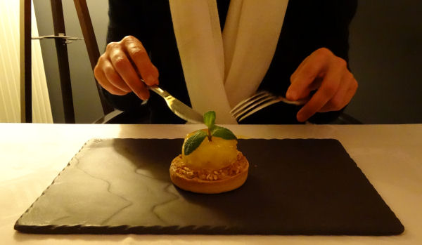 Il s’agit d’un restaurant qui sert aussi de la cuisine omnivore mais le fait qu’il propose aussi des plats végétariens nous intrigue positivement. Le chef n’est pas le premier venu. Vincent Croizard a une longue et riche expérience derrière lui. Son établissement est d’une discrétion totale : une simple porte de maison donnant sur une ruelle souvent déserte. Seul signe distinctif : elle est surmontée du nom du restau et d’un panneau indiquant qu’il a trois toques au Gault et Millau, ce qui veut dire du très beau niveau en perspective.