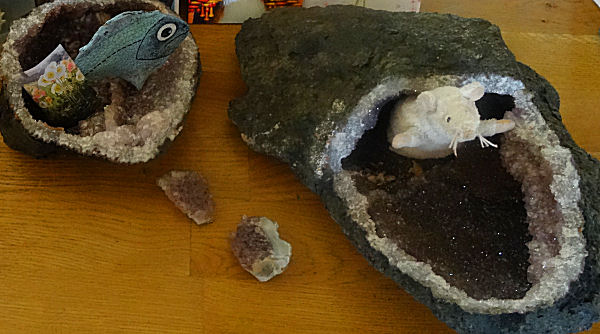 Il s’agissait d’une très belle géode d’améthyste en deux morceaux, achetée la veille au salon des minéraux et fossiles où Didier m’a servi de guide et d’expert de haut niveau (il connaissait quasiment tous les exposants). Un détail amusant est qu’avant-hier soir, pendant le dîner des Chats Libres, Anti est tombée en arrêt devant une pub pour ce salon. J’ai fait comme si de rien n’était mais je me marrais intérieurement en sachant ce qu’elle allait découvrir quelques heures plus tard.