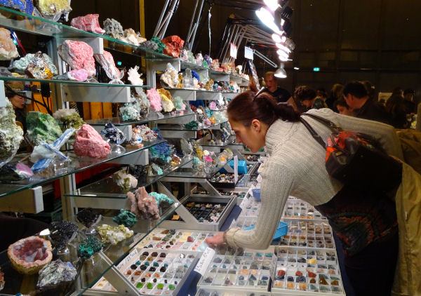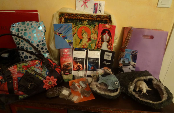 C’est donc très naturellement que nous avons décidé d’aller faire un tour à ce même salon tous les deux dans l’après-midi. Et là, les cadeaux ont continué à pleuvoir : un pendentif taillé dans un morceau de météorite pour qu’elle ait un petit bout d’étoile autour du cou, un magnifique bloc de pierre dans lequel étaient enchâssés des fossiles d’oursins vieux de 15 millions d’années (bretons de surcroît), un bloc de labradorite aux reflets bleutés fascinants, un collier de pierres fines, d’autres minéraux divers…