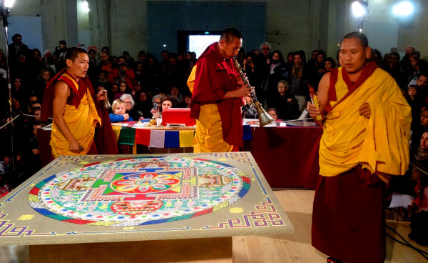 La présentation des œuvres était à la fois dénudée, simple et aérée, les grands volumes de l’édifice donnant une sensation d’espace très agréable. Au centre trônait le mandala réalisé par des moines tibétains pendant plusieurs jours d’affilée. Ces moines venaient du sud de l’Inde, une région du monde où se trouvent la plupart des exilés tibétains. La fin de l’expo était marquée par la dissolution du mandala.