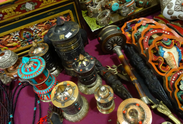 Dans un coin de la chapelle, les moines avaient, comme à l’accoutumée, un stand boutique d’objets tibétains. Les objets exposés étaient de très grande qualité, dont certains que nous n’avions jamais vus avant.