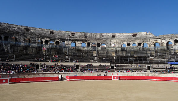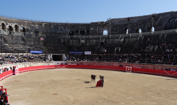 Il faut dire que les promeneurs qui passaient par là n’avaient aucune envie d’y rester avec tout le boucan qu’on faisait et le déploiement intimidant des forces de l’ordre venues en nombre. Bien qu’en pleine période de vacances et avec un temps magnifique, personne n’est venu grossir les rangs des spectateurs. Les rares touristes qui sont entrés sont repartis aussi vite, choqués par le massacre qui s’y déroulait. Ailleurs dans Nîmes, il y avait foule – dans les rues, aux terrasses des troquets, au jardin de la Fontaine. Mais pas aux arènes.