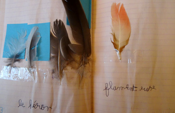 Enzo est avec nous cette semaine et il nous a apporté un trésor magnifique : un plumier. Pas un plumier où on range des sergents-majors. Non, un cahier où il range les plumes d’oiseau qu’il trouve au gré de ses balades. Il les fait tenir avec du scotch et, pour toutes celles qu’il a déjà, il a cherché sur internet le nom de l’oiseau qui les a portées. Petite visite en images…