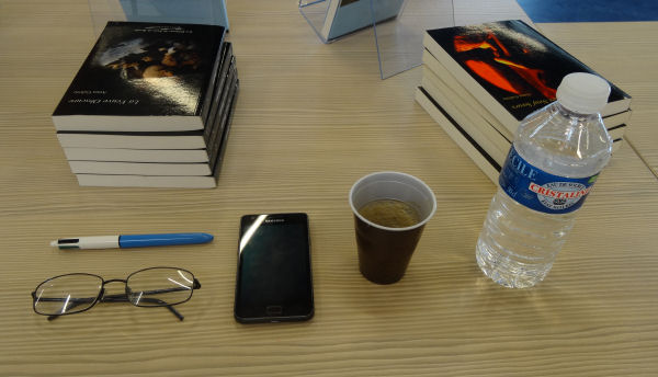 Quelqu’un de Cultura m’a proposé un café et de l’eau. Super. J’ai installé mon petit nécessaire à dédicace : stylo quatre couleurs, téléphone (pour surfer pendant les moments creux), lunettes (idem), café, bouteille d’eau. Les trois livres proposés étaient ceux de ma dernière trilogie : Le septième livre, La veuve obscure et Les neuf sœurs.