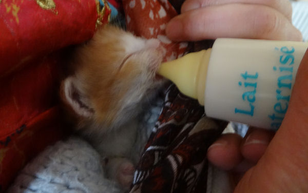 Elle le nourrit goutte par goutte à la seringue. S’il tient le coup jusqu’à demain, elle l’emmènera chez Sandra pour voir si on peut le nourrir plus efficacement.
