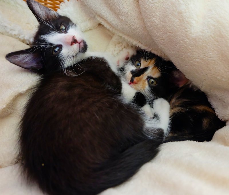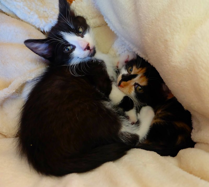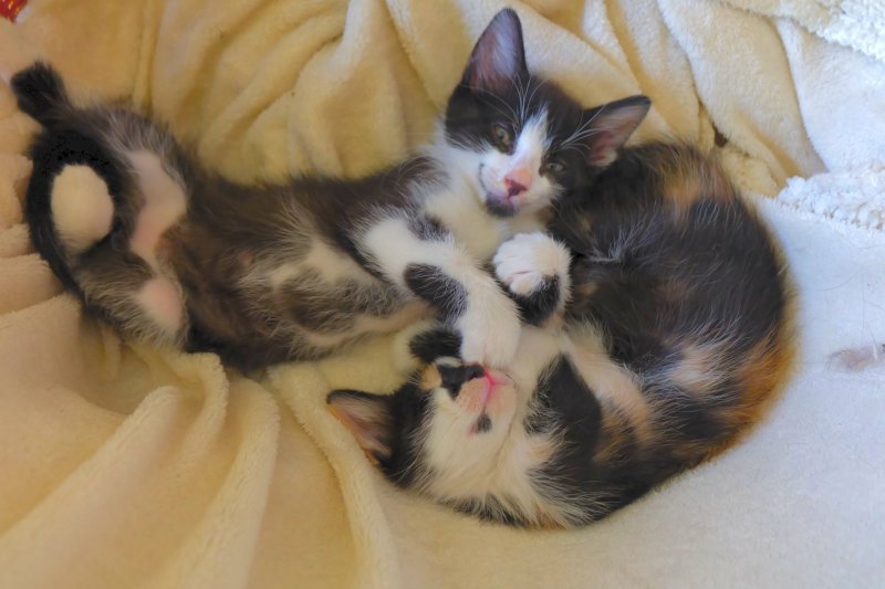 Leur maman a été recueillie par l’une des bénévoles de l’association, ils cherchent donc une famille d’amour pour la vie. Ils adorent jouer ensemble et sont tout perdus quand ils ne se voient plus, ils se mettent alors à s’appeler jusqu’à ce que l’un ou l’autre n’arrive en courant pour rassurer le premier, ce qui fonctionne à merveille. Ils sont vraiment adorables ! Les regarder évoluer apporte un bien-être sans égal.