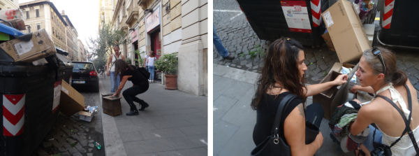 Vendredi après-midi, alors que nous quittions l’hôtel où nous logions à Rome, elle tombe sur deux vieux tabourets de cireur de chaussure au milieu de sacs poubelle divers. Elsa et elle se mettent alors à regarder les précieux trésors sous tous les angles. Inutile de préciser qu’ils sont plutôt plus volumineux que la plus grosse de nos valises, elles font aussitôt demi-tour pour les ramener à l’hôtel avant que nous poursuivions notre promenade.